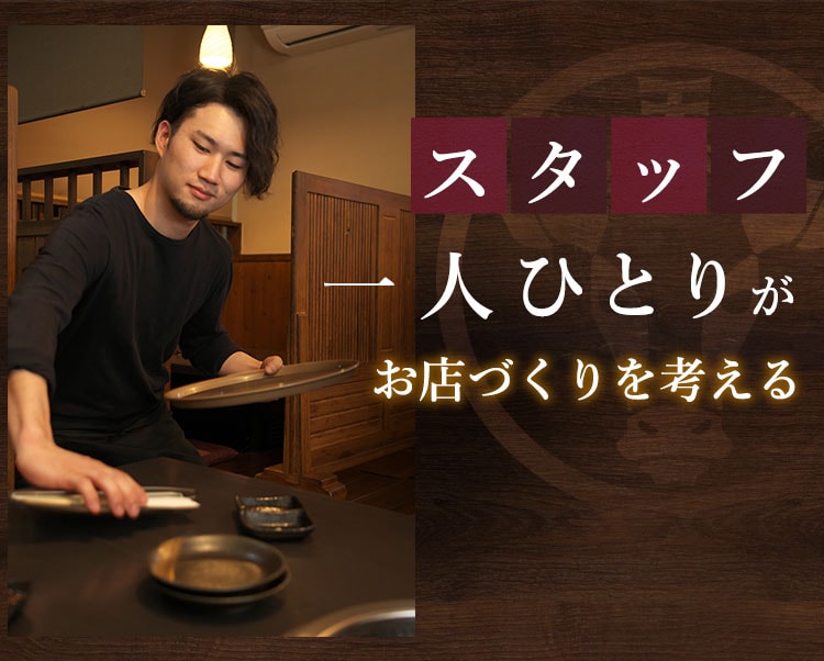 美味しいお肉だけでなく、スタッフの笑顔が当店のもう一つの魅力です。当店を訪れたお客様を笑顔にするために、スタッフ自らが笑顔になれる工夫をしています。一人一人がお客様に喜んで貰えるようアイデアを出し合い、お店を支えています。こだわりのお肉と心のこもった接客で、お客様に感動していただけるようなお店づくりを目指しております。